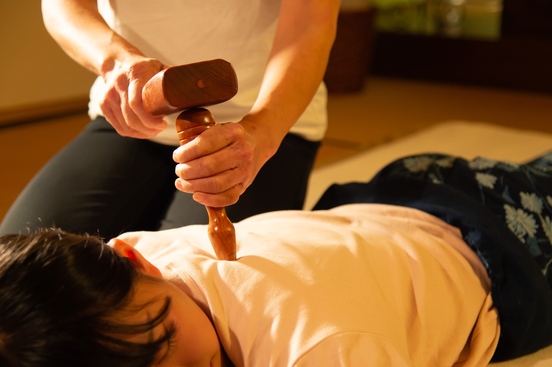 特に筋緊張の強いところには、木槌を使って身体をトントンと叩きながら筋肉を緩める技法を用います。痛くないのにほぐれていく不思議な感覚。タイ王国北部に伝わる技法で、独特な響きには心地良さが感じられます。